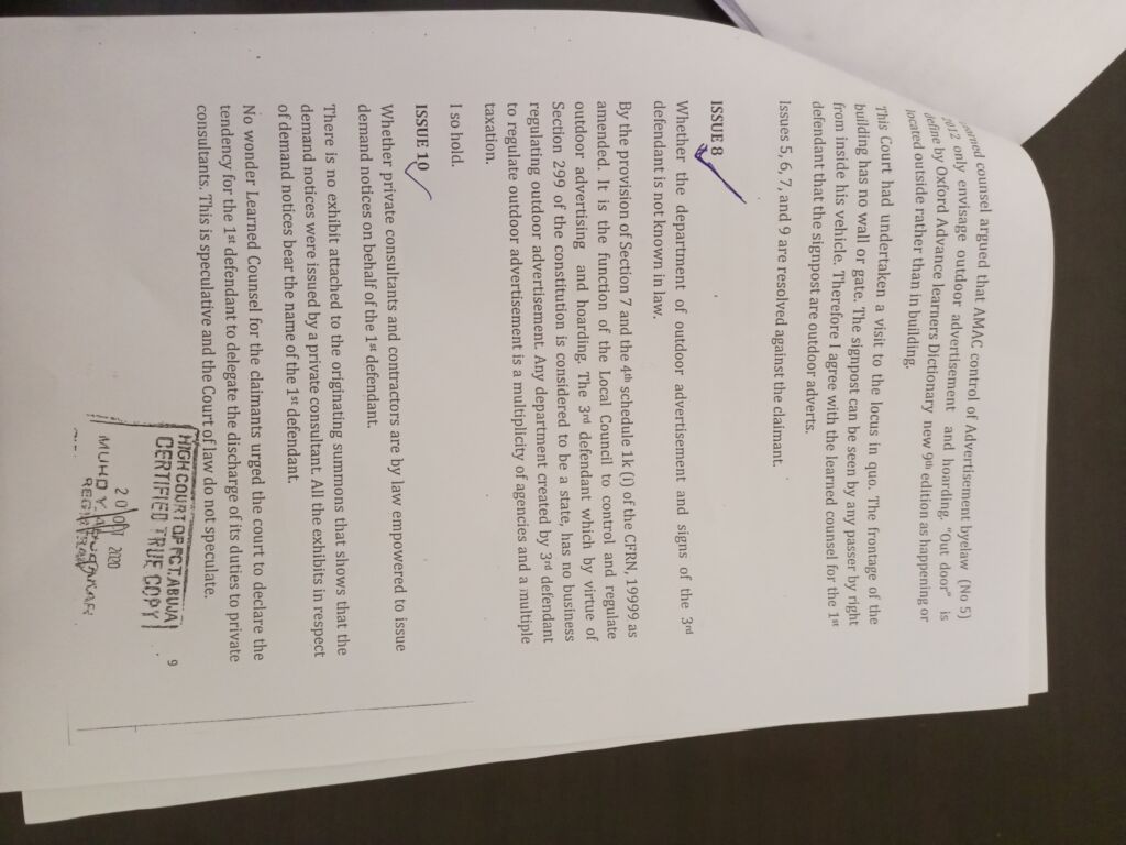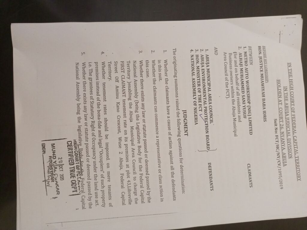 A copy of the judgment for suit no: FCT/HC/NY/CV/1095/2019 sighted by the Abuja Inquirer stated that FCT DOAS has no business in regulating revenue and creating such is multiplicity of agencies and double taxation.