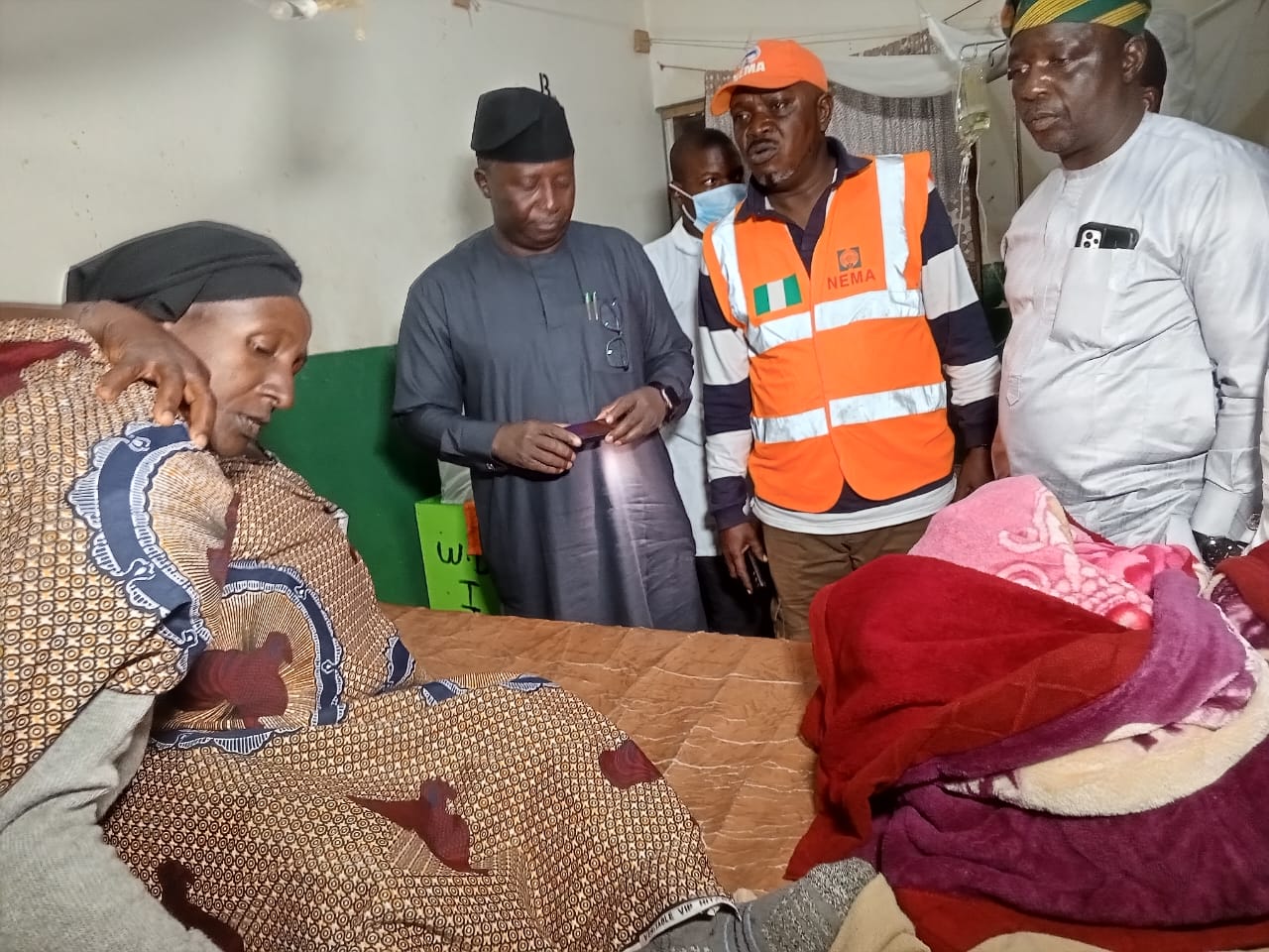 The non-food items provided by NEMA comprise cartons of detergent and toilet soap, bundles of mosquito nets, and blankets.