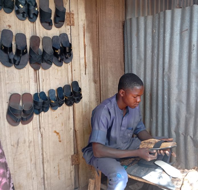 Seventeen-year-old Abubakar Mustapha carefully pieces together the straps of a new pair of footwear at a small roadside shop in Shuni, Sokoto State.