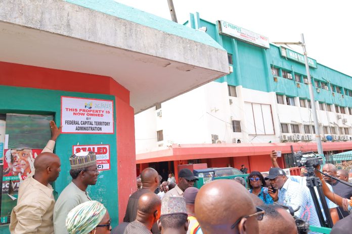 The Federal Capital Territory Administration on Monday, sealed the national headquarters of the Peoples Democratic Party, PDP, located at the popular Wadata Plaza, Wuse Zone 5, as the crackdown on properties owing decades of ground rent intensified.